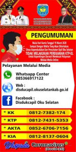 Assalamualaikum dulur2 se-OKU Selatan anget, untuk menunda dulu segalo urusan ke DISDUKCAPIL OKU SELATAN, kalu idak mendesak nian (masuk rumah sakit), mohon maaf kami untuk sementaro idak melayani, payo samo2 waspada corona, kito idak tau apa kito tertular atau bahkan menularkan virus corona ini, BUKANNYO IDAK SEIJOAN, tapi ini demi keselamatan kito galo2, layanan dukcapil oku selatan ditiadokan sampai waktu yang akan ditentukan, harap maklum, terimo kasih…!!!