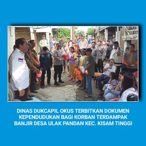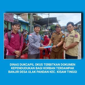 Dalam Kesempatan ini Juga Dinas Dukcapil OKUS diwakili Kepala Bidang Inovasi & Pemanfaatan Data, Anas Muslim, SH Melalu inovasi “Tabah Dulurku” Menerbitkan dan Menyerahkan Sejumlah Dokumen Kependudukan yang turut hilang akibat terbawa arus Kepada Korban Terdampak bencana alam.