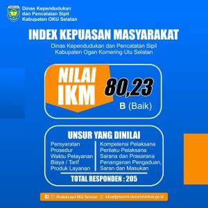 Dinas Kependudukan dan Pencatatan Sipil Kabupaten Ogan Komering Ulu Selatan Mendapatkan Nilai IKM 80,23 B (Baik) Adapun Unsur yang dinilai dapat dilihat pada gambar berikut dengan Total Responden 205