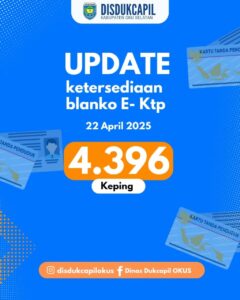 UPTADE Ketersediaan Blanko E-KTP di Dinas Kependudukan dan Pencatatan Sipil Kabupaten Ogan Komering Ulu Selatan berjumlah 4.396 Keping